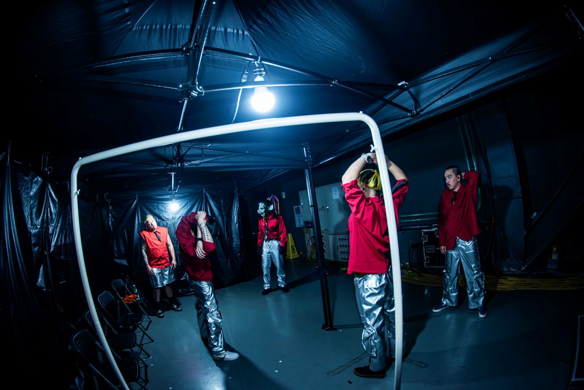 隨後,演出前一小時就看見團員們自主開始暖身:GIGO 一邊發聲,同時與吉他手 Matt 在後台長廊上來回奔跑,鼓手彥文聽著歌快走維持節奏感,最後每個人都隨著阿霖與金毛利用牆面拉筋⋯⋯力求精神飽滿、狀態穩定,隨時準備好上工。