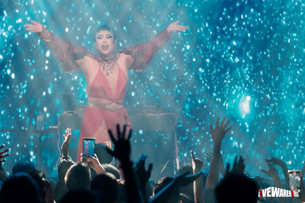 第三組〈美蘇辣台妹〉,是由三位美蘇拉家族的成員分別帶來三段組曲表演,其各有不同風貌。Honey ji以本土電音為主軸,從閃亮三姐妹〈誰誰誰〉的混音再到法拉利姐張婷婷的直播語音對嘴,將擷取電影台詞名場面的spoken word lip sync轉化出在地特色,觀眾無不驚喜叫好;Yugee則是化身王心凌,不是以舞步動作,而是靠演繹歌曲、捕捉氛圍,表現甜美迷人的舞台魅力,也讓整組表演的情緒起伏有所變奏。壓軸的瑪莉安,則安排了一整段張惠妹演唱會的原音,她並高明掌握了所有停頓、延宕與高潮,在精準的收與放之間,彷彿就是張惠妹本人親臨,將LIVE WAREHOUSE化成高雄國家體育場,全場觀眾無不投入忘我。