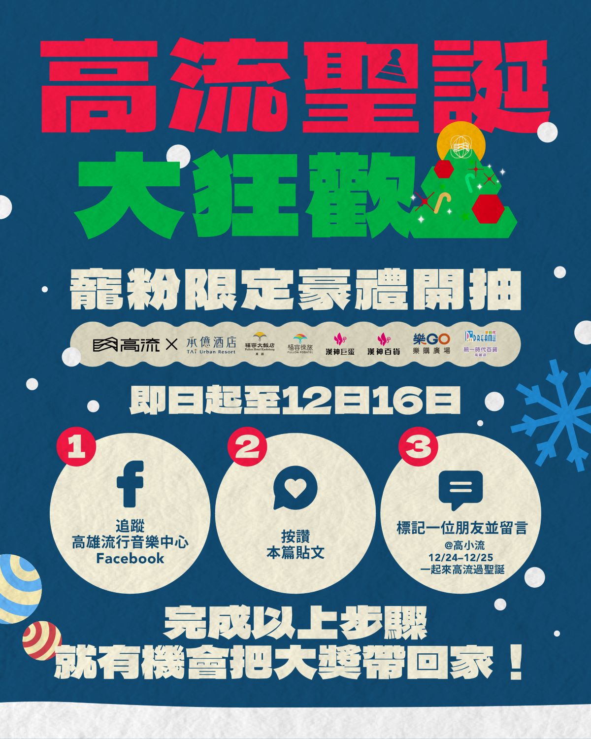 - 標記@一位朋友並留言,寫下「 12/24–12/25 一起來高流過聖誕」