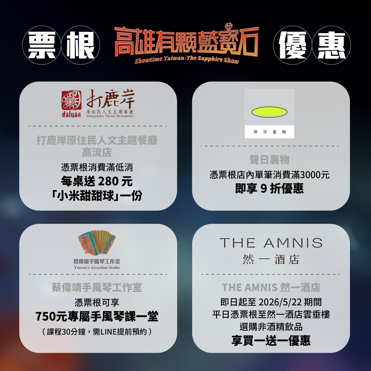 憑《高雄有顆藍寶石》票根,店內單筆消費滿 3,000 元,即享「9 折優惠」。